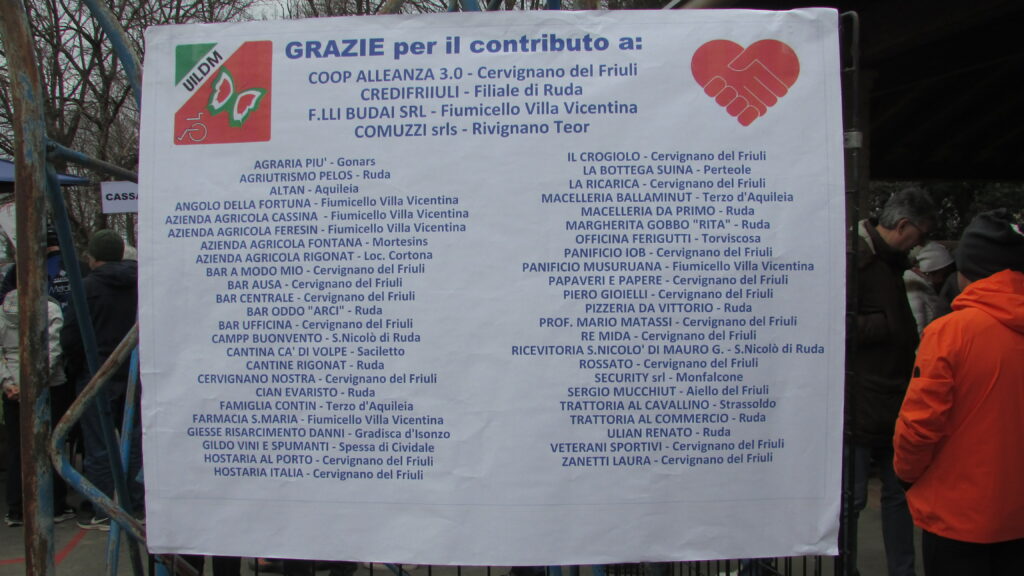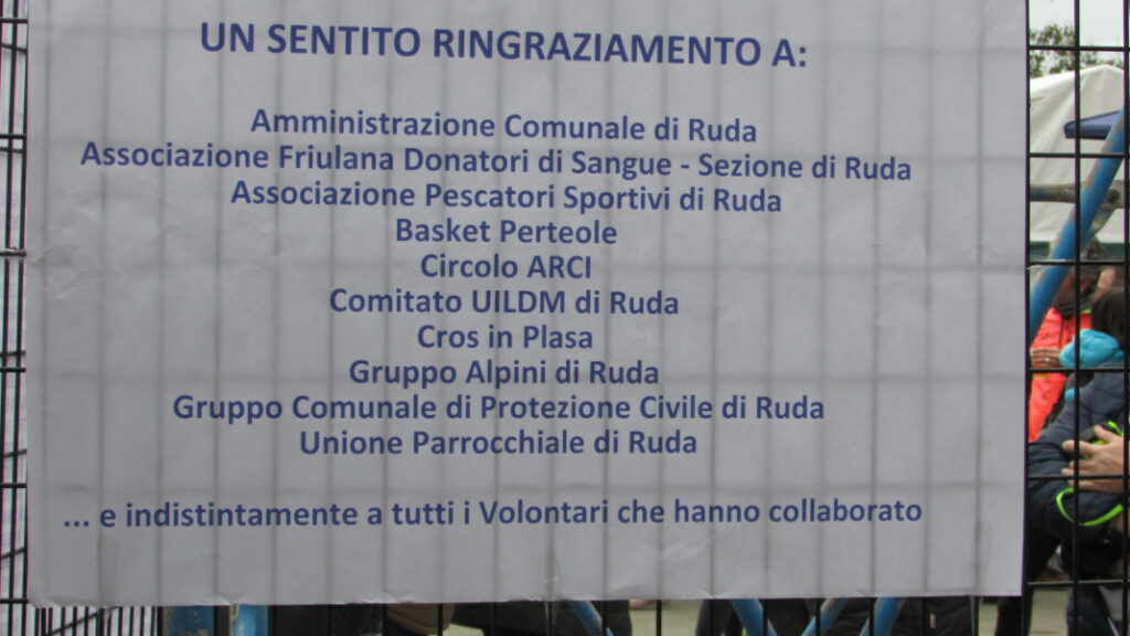 Motore dell’iniziativa, il cui ricavato sarà devoluto a sostegno delle attività della UILDM di Udine, sono state l’Unione sportiva ACLI Ruda e le ACLI di Ruda, guidate dal presidente Ludovico Rigonat, affiancate dall’Amministrazione comunale, dall’Associazione friulana donatori di sangue, dall’Associazione pescatori sportiva, dal Basket Perteole, dal Circolo Arci, dai Cros in plasa, dal Gruppo alpini, dal Gruppo comunale di protezione civile, dall’Unione parrocchiale e dall’immancabile Comitato UILDM di Ruda che dagli anni Ottanta sostiene l’ associazione anche grazie alle delizie preparate dalle “signore delle torte”.